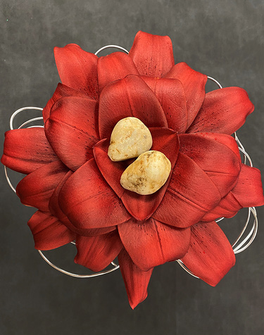 A very simple design concept, our lily “topiary” features just two stems of ‘Armandale’ L.A. hybrid lilies. A pair of these arrangements would be elegant on a fireplace mantel or framing a groom’s cake. Create them in three different sizes/heights, and group the trio for an impactful accent that is quick to create!