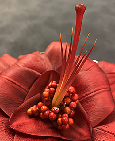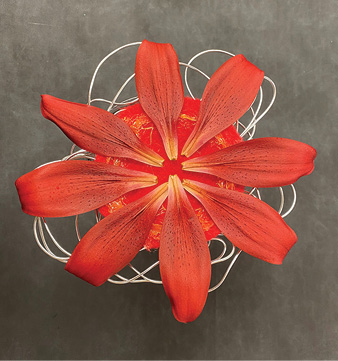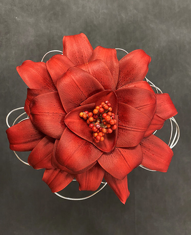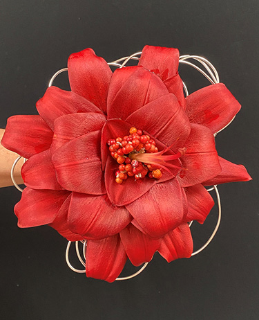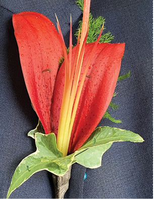 We altered an L.A. hybrid ‘Armandale’ into a tailored boutonniere using one wide and one narrow tepal. Both are wired using the hook method and are surrounded by plumosa fern and ‘Glacier’ ivy leaves. Lilies are often too large to wear, so farmer florists should use the petals and sepals as design elements.