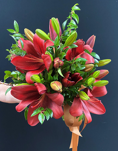 Here comes the bride! A classic hand-tied arrangement features our rusty red lilies combined with huckleberry foliage (Vaccinium ovatum), bound with waterproof tape (also known as florist pot tape) and wrapped with a light brown, satin ribbon.