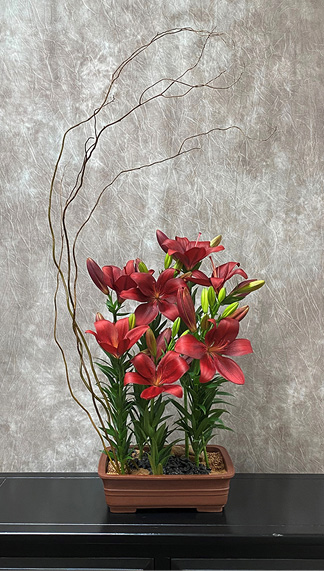 We were inspired by the parallel lines of growing lilies and wanted to feature not only their flowers, but their stems and foliage, too. The lilies are arranged in parallel lines and framed by a crescent of corkscrew willow stems. The overall design is reminiscent of a Japanese garden. These versatile arrangements can be displayed singly or in multiple combinations for church altars, side tables, food service tables, or either side of a bride’s or groom’s cake.