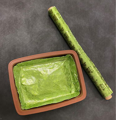 We began with a terra cotta bonsai dish and lined it with vinyl-clad foil. Then, we added fully hydrated, fresh floral foam to the container. Always be sure that containers you select for event floral designs do not leak water. Often, adding an extra layer of protection saves time and effort.