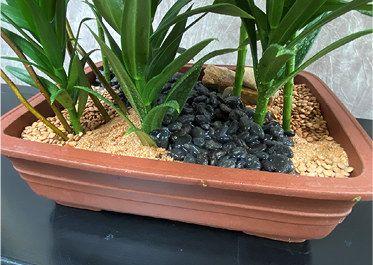 Once we added the plant materials, we covered the foam with a series of basing treatments including sand, rocks, pebbles, and lentil seeds, then misted the surface to help set the elements in place. After a few days, the lentil seeds will sprout into a small, leafy garden.