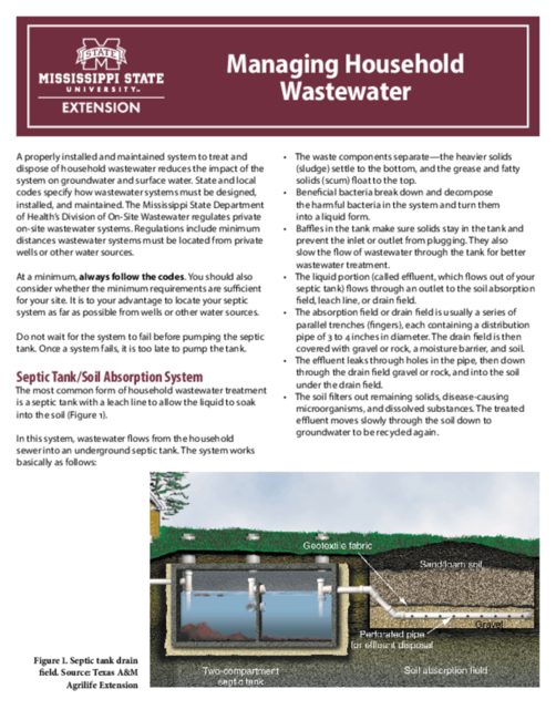 A properly installed and maintained system to treat and dispose of household wastewater reduces the impact of the system on groundwater and surface water. State and local codes specify how wastewater systems must be designed, installed, and maintained. The Mississippi State Department of Health’s Division of On-Site Wastewater regulates private on-site wastewater systems. Regulations include minimum distances wastewater systems must be located from private wells or other water sources.