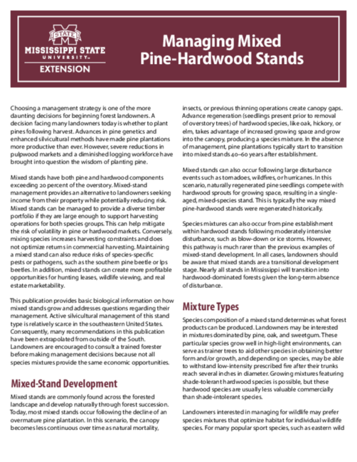 This publication provides basic biological information on how mixed stands grow and addresses questions regarding their management. Active silvicultural management of this stand type is relatively scarce in the southeastern United States. Consequently, many recommendations in this publication have been extrapolated from outside of the South. Landowners are encouraged to consult a trained forester before making management decisions because not all species mixtures provide the same economic opportunities.