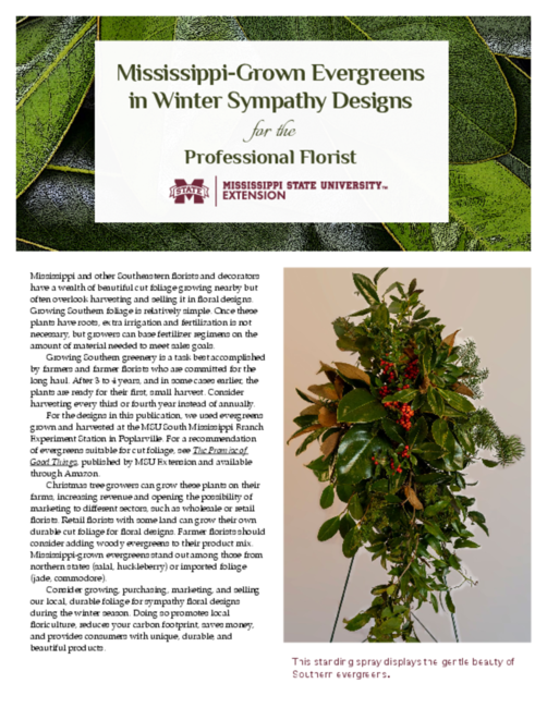 Christmas tree growers can grow these plants on their farms, increasing revenue and opening the possibility of marketing to different sectors, such as wholesale or retail florists. Retail florists with some land can grow their own durable cut foliage for floral designs. Farmer florists should consider adding woody evergreens to their product mix. Mississippi-grown evergreens stand out among those from northern states (salal, huckleberry) or imported foliage (jade, commodore).
