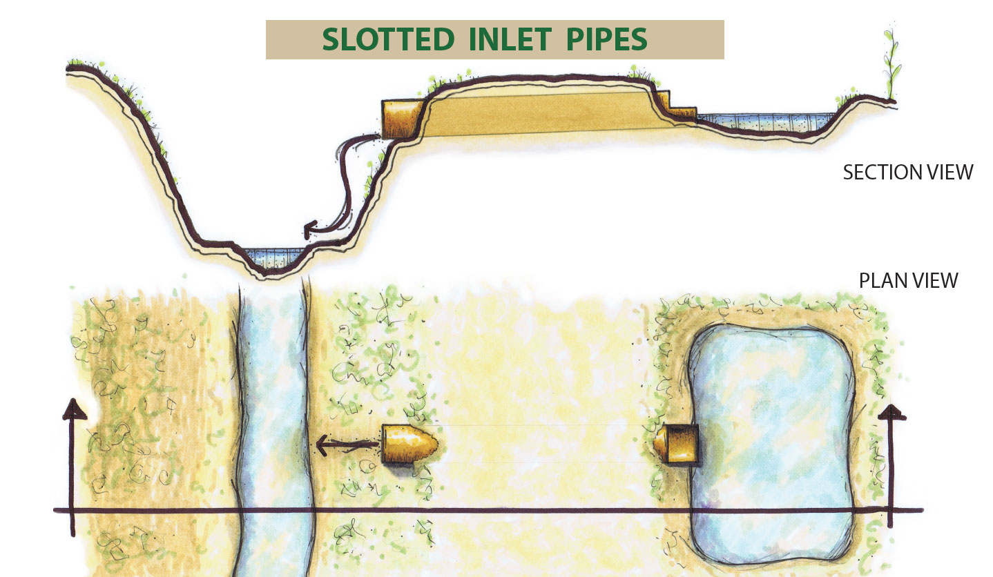 Slotted inlet pipes minimize soil loss and decrease sediment in runoff by preventing head-cutting within the downstream drainage ditch. Preliminary research shows that between 7.3 and 41.6 pounds of phosphorus are retained per pipe. Maintenance of pipes is required to ensure their effectiveness.5 Preliminary data suggest cleaning sediment from behind pipes every 396 days or about once a year.5