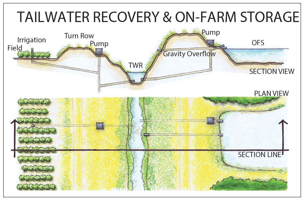 A tailwater recovery system (NRCS conservation practice 436, irrigation regulating reservoir, or 447, irrigation system, tailwater recovery) is a water-storage structure, often a widened ditch, used for catching irrigation water or rainfall that runs off the landscape for later reuse. The system increases water use efficiency, increases retention time, and reduces energy consumption.