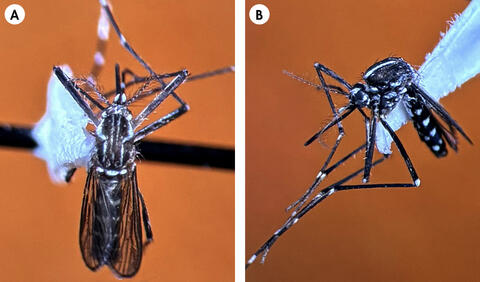 - Dark brown/black mosquito with white bands on legs and spots on body. White/silver lyre- or harp-shaped stripes on top of thorax (A). Similar in appearance to the commonly encountered Asian tiger mosquito (Ae. albopictus), with single white stripe on thorax (B).