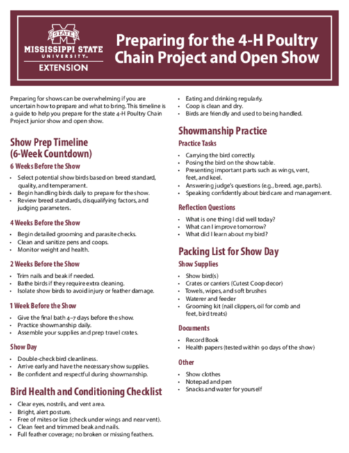 Preparing for shows can be overwhelming if you are uncertain how to prepare and what to bring. This timeline is a guide to help you prepare for the state 4-H Poultry Chain Project junior show and open show.