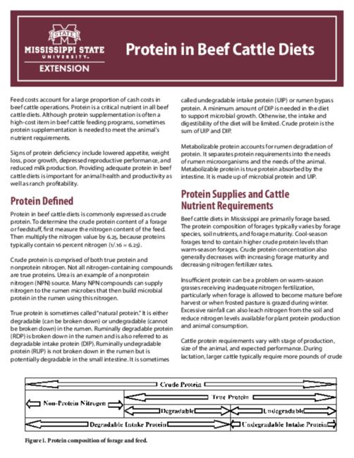 This publication provides detailed insights into protein types, supplementation strategies, risks of nonprotein nitrogen sources, and management practices to optimize beef cattle nutrition and productivity. It emphasizes that protein supplementation decisions should consider the animals’ stage of production, dietary needs, and forage quality, with a strong recommendation to purchase supplements based on cost per unit of protein. You can also contact state Extension specialists or your local Extension office for answers to specific questions.