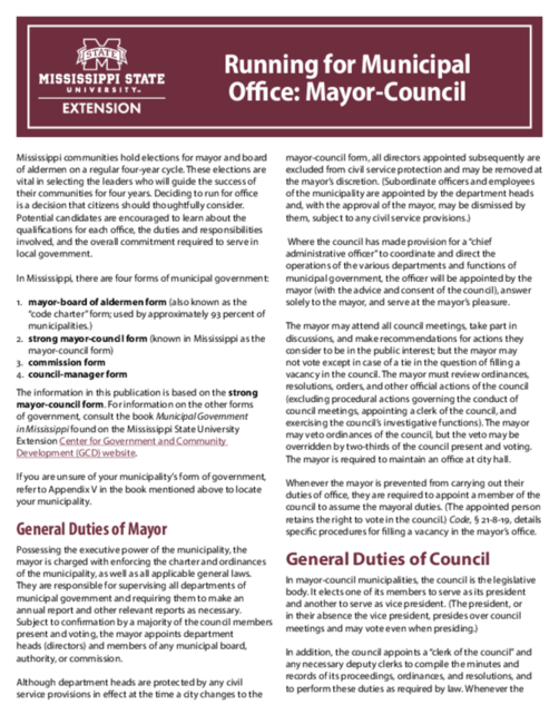 The information in this publication is based on the strong mayor-council form. For information on the other forms of government, consult the book Municipal Government in Mississippi found on the Mississippi State University Extension Center for Government and Community Development (GCD) website.
