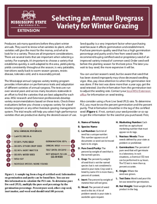 The Mississippi annual ryegrass variety testing program provides information on performance traits and adaptation of different varieties of annual ryegrass. The tests are run over several years and across many locations statewide in an effort to find the varieties that are best adapted for each area. MSU research and Extension professionals develop variety recommendations based on these tests. Check these evaluations before you choose a ryegrass variety for a beef stocker program or any other livestock grazing management system. The trial results will help you select high-performance varieties that are productive during the desired season of use.
