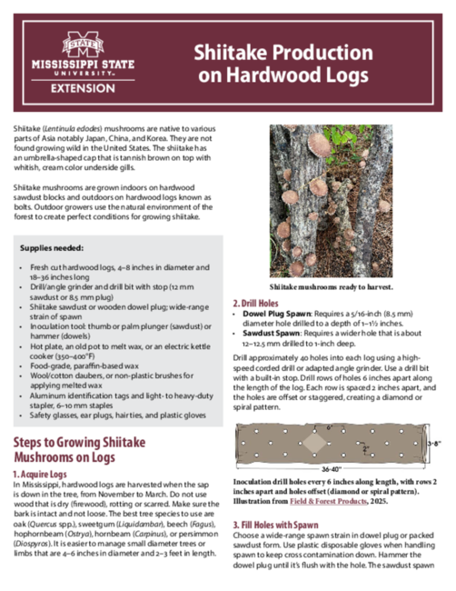 In Mississippi, hardwood logs are harvested when the sap is down in the tree, from November to March. Do not use wood that is dry (firewood), rotting or scarred. Make sure the bark is intact and not loose. The best tree species to use are oak (Quercus spp.), sweetgum (Liquidambar), beech (Fagus), hophornbeam (Ostrya), hornbeam (Carpinus), or persimmon (Diospyros). It is easier to manage small diameter trees or limbs that are 4–6 inches in diameter and 2–3 feet in length.