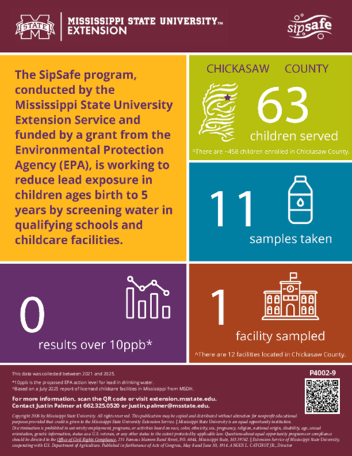 The SipSafe program, conducted by the Mississippi State University Extension Service and funded by a grant from the Environmental Protection Agency (EPA), is working to reduce lead exposure in children ages birth to 5 years by screening water in qualifying schools and childcare facilities.