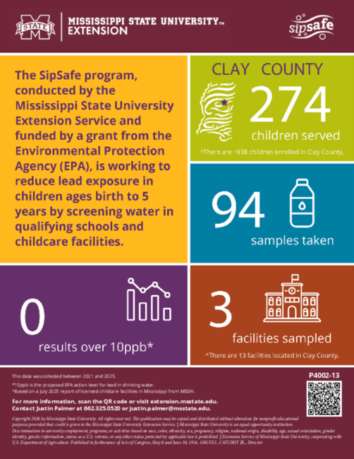 The SipSafe program, conducted by the Mississippi State University Extension Service and funded by a grant from the Environmental Protection Agency (EPA), is working to reduce lead exposure in children ages birth to 5 years by screening water in qualifying schools and childcare facilities.