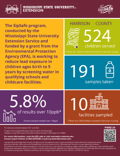The SipSafe program, conducted by the Mississippi State University Extension Service and funded by a grant from the Environmental Protection Agency (EPA), is working to reduce lead exposure in children ages birth to 5 years by screening water in qualifying schools and childcare facilities.
