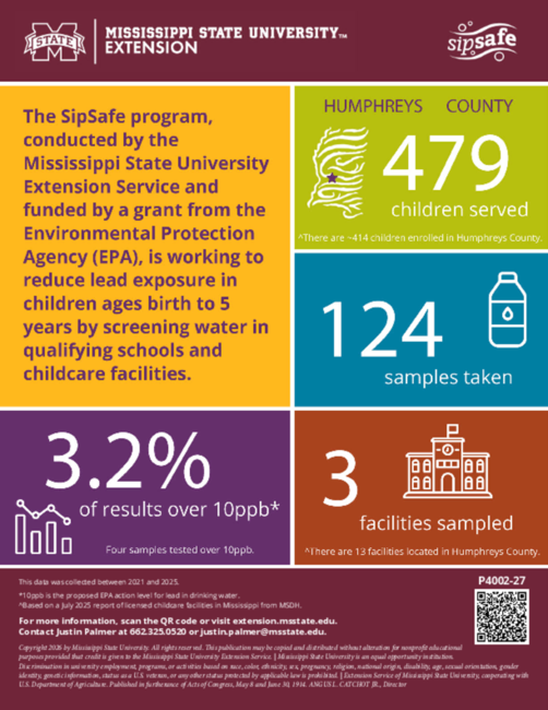 The SipSafe program, conducted by the Mississippi State University Extension Service and funded by a grant from the Environmental Protection Agency (EPA), is working to reduce lead exposure in children ages birth to 5 years by screening water in qualifying schools and childcare facilities.