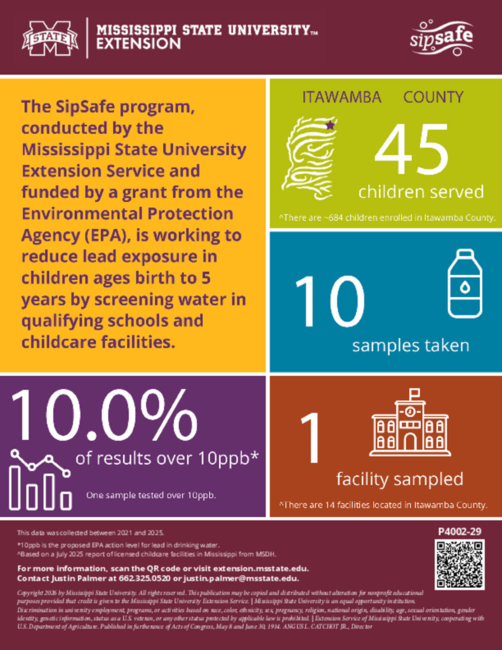 The SipSafe program, conducted by the Mississippi State University Extension Service and funded by a grant from the Environmental Protection Agency (EPA), is working to reduce lead exposure in children ages birth to 5 years by screening water in qualifying schools and childcare facilities.