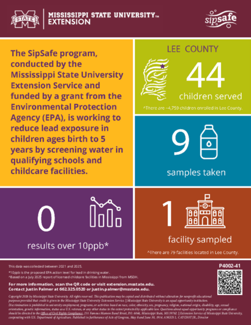 The SipSafe program, conducted by the Mississippi State University Extension Service and funded by a grant from the Environmental Protection Agency (EPA), is working to reduce lead exposure in children ages birth to 5 years by screening water in qualifying schools and childcare facilities.