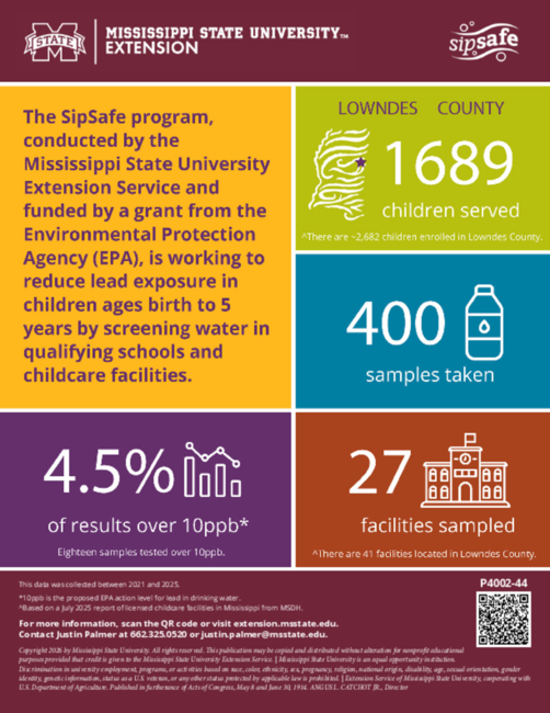 The SipSafe program, conducted by the Mississippi State University Extension Service and funded by a grant from the Environmental Protection Agency (EPA), is working to reduce lead exposure in children ages birth to 5 years by screening water in qualifying schools and childcare facilities.