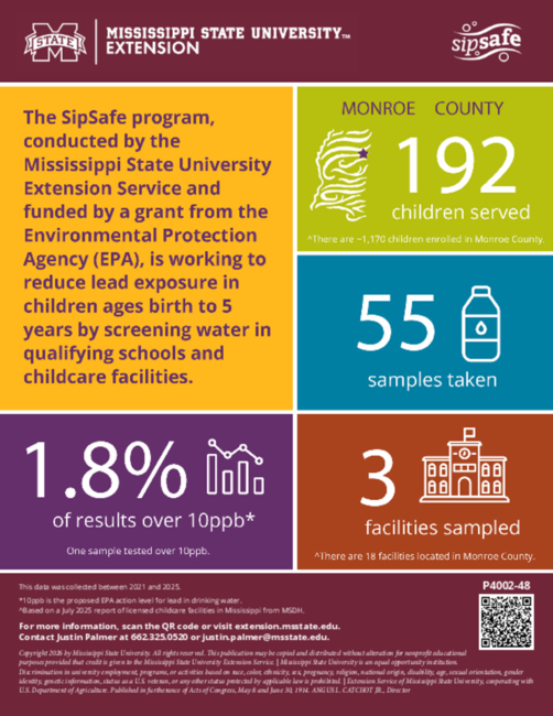 The SipSafe program, conducted by the Mississippi State University Extension Service and funded by a grant from the Environmental Protection Agency (EPA), is working to reduce lead exposure in children ages birth to 5 years by screening water in qualifying schools and childcare facilities.
