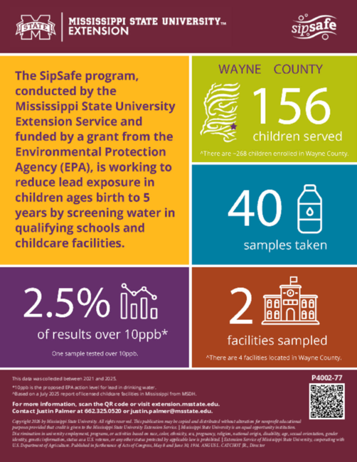 The SipSafe program, conducted by the Mississippi State University Extension Service and funded by a grant from the Environmental Protection Agency (EPA), is working to reduce lead exposure in children ages birth to 5 years by screening water in qualifying schools and childcare facilities.