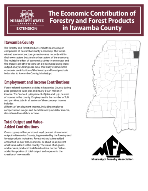 The forestry and forest products industries are a major component of Itawamba County’s economy. The forest-related economic sectors generate value not only within their own sectors but also in other sectors of the economy. The multiplier effect of economic activity in one sector and the impacts on other sectors can be estimated using input-output analysis. Using 2022 data, this study estimates the economic contribution of the forestry and forest products industries to Itawamba County, Mississippi.