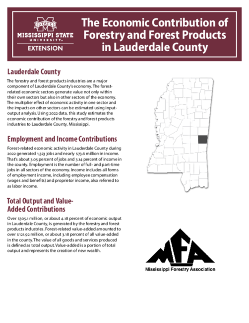 The forestry and forest products industries are a major component of Lauderdale County’s economy. The forest-related economic sectors generate value not only within their own sectors but also in other sectors of the economy. The multiplier effect of economic activity in one sector and the impacts on other sectors can be estimated using input-output analysis. Using 2022 data, this study estimates the economic contribution of the forestry and forest products industries to Lauderdale County, Mississippi.