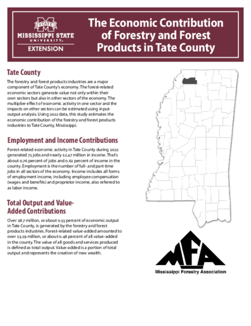 The forestry and forest products industries are a major component of Tate County’s economy. The forest-related economic sectors generate value not only within their own sectors but also in other sectors of the economy. The multiplier effect of economic activity in one sector and the impacts on other sectors can be estimated using input-output analysis. Using 2022 data, this study estimates the economic contribution of the forestry and forest products industries to Tate County, Mississippi.