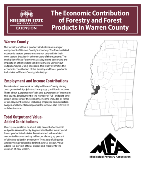 The forestry and forest products industries are a major component of Warren County’s economy. The forest-related economic sectors generate value not only within their own sectors but also in other sectors of the economy. The multiplier effect of economic activity in one sector and the impacts on other sectors can be estimated using input-output analysis. Using 2022 data, this study estimates the economic contribution of the forestry and forest products industries to Warren County, Mississippi.