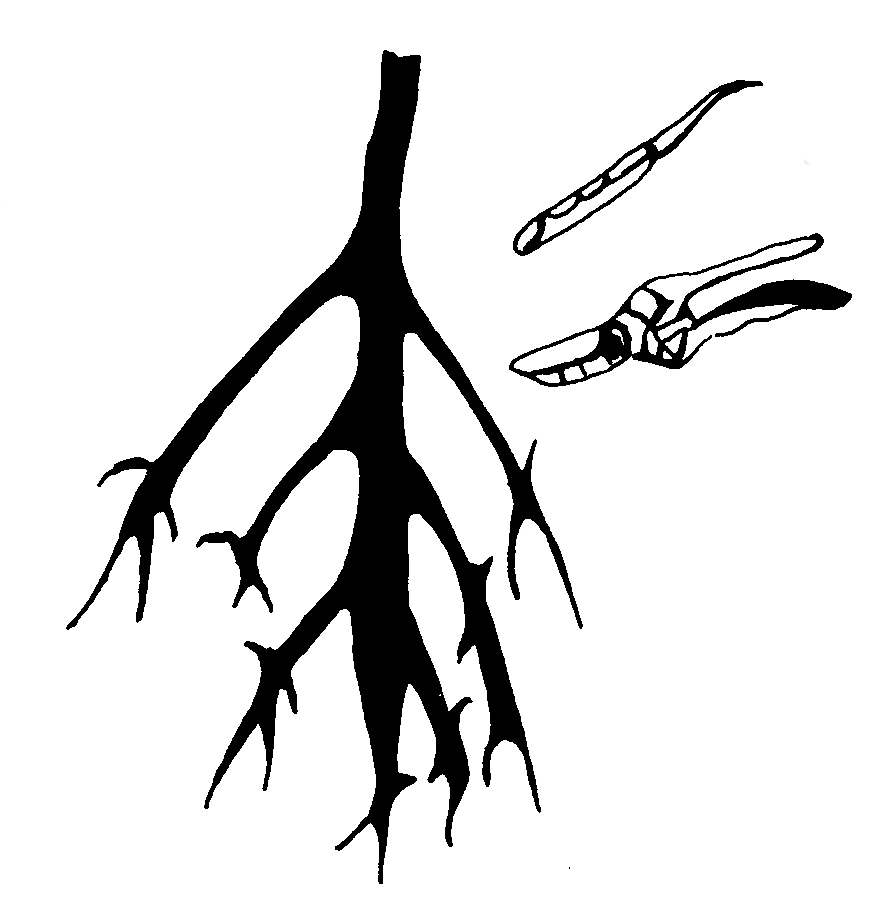 Before planting, cut off all broken or damaged roots with sharp shears or a knife. Most new roots develop on side roots and within a foot from the tap root. The tap root may also be pruned, as it will regrow, but do not cut it shorter than about 18 inches. Examine the roots closely to ensure they are free of serious diseases or insects.