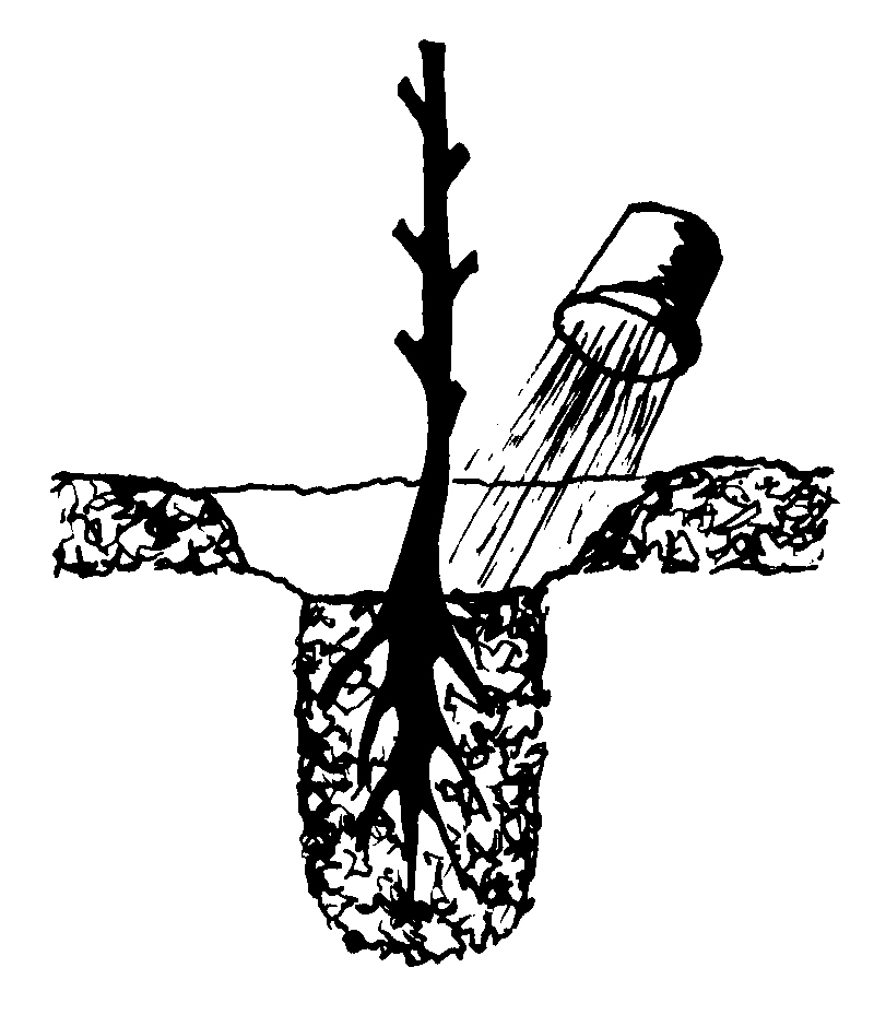 Set the tree at the same depth at which it grew in the nursery. Arrange the roots in their natural position. Fill the holes about three-fourths full with friable top soil. Work the soil around the roots to remove air pockets. Pour water into the hole to settle the soil, which will further reduce air pockets and keep the roots moist.