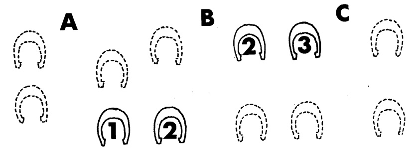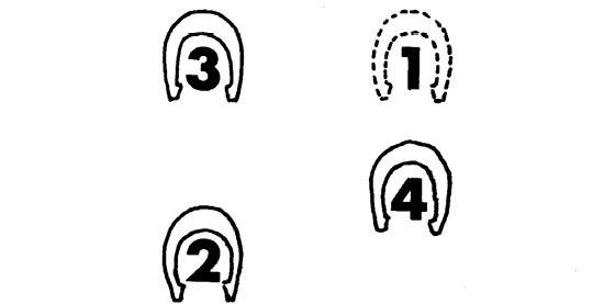 To start the canter at the left lead, shift your weight toward your horse’s right hindquarter while slightly lifting its head with the reins. With your right leg well back, give it a light boot to push its hindquarters to the left, and at the same time urge it into the canter. Your left leg should be slightly forward toward the horse’s left shoulder, twisting you slightly in the saddle. The idea is to start your horse a little toward the left instead of straight ahead and to lighten its left forequarter by shifting your weight to its right hindquarter. (The directions for taking the right lead are exactly opposite.) Always remember that you start the canter with your weight back, not forward as in the walk or trot.