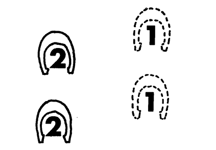 At the trot, you undergo a definite impact that tends to throw you from the saddle. The correct way to ride a trot with English equipment is by posting. Posting can best be described as a rocking motion that is equally comfortable to the horse and rider; you rise gently from the saddle and ease back into it with the two beats of the trot. Use your balance from the stirrups half the time and contact with your knees and thighs the other half. To maintain a secure seat, your knees and thighs must be in contact with the saddle at all times. If your weight is evenly distributed, your legs should not swing as you post. Posting should not be a forced, labored rising from the saddle to stand in the stirrups. You are posting on the right diagonal when you rise from the saddle with the horse’s right shoulder, and on the left diagonal when you rise with the left shoulder. Most stock or pleasure horses with western equipment are not usually ridden at the trot for very long periods. A fast trot with a long stride must be posted as with English equipment. You can “ride out” a slow trot by sitting down flat in the saddle.
