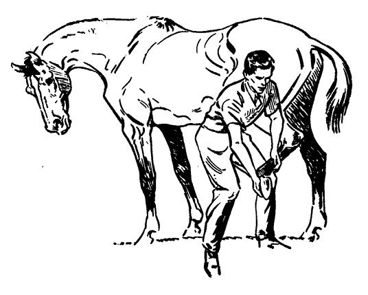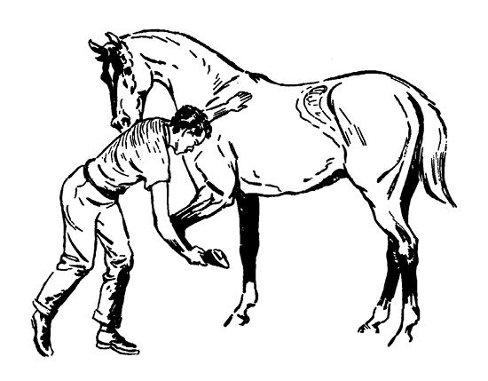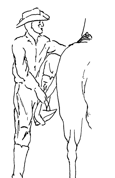 After tightening the saddle, it is always good to “untrack” the horse by leading it ahead several paces before mounting. This untracking does two things. First, if your horse is the kind that blows up so that it cannot be cinched snugly, the untracking will usually cause it to relax. Second, if a horse has any bad habits, it will often get them out of its system before the rider mounts.