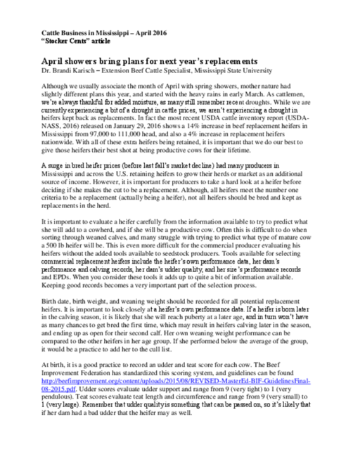 Stocker Cents April 2016 Download Contacts Dr. Brandi Karisch Assoc Extension/Research Prof Animal & Dairy Science brandi.karisch@msstate.edu Topics Beef