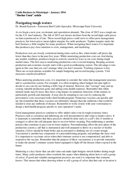 Stocker Cents January 2016 Download Contacts Dr. Brandi Karisch Assoc Extension/Research Prof Animal & Dairy Science brandi.karisch@msstate.edu Topics Beef