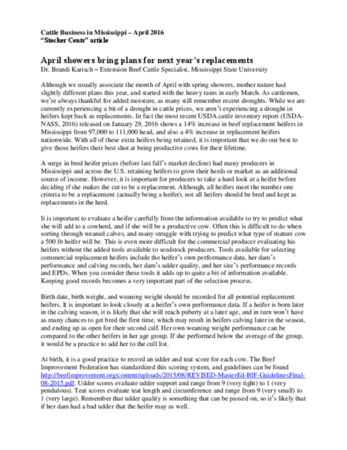 Stocker Cents March 2016 Download Contacts Dr. Brandi Karisch Assoc Extension/Research Prof Animal & Dairy Science brandi.karisch@msstate.edu Topics Beef