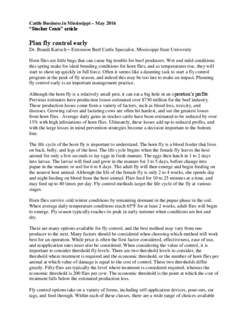 Stocker Cents May 2016 Download Contacts Dr. Brandi Karisch Assoc Extension/Research Prof Animal & Dairy Science brandi.karisch@msstate.edu Topics Beef